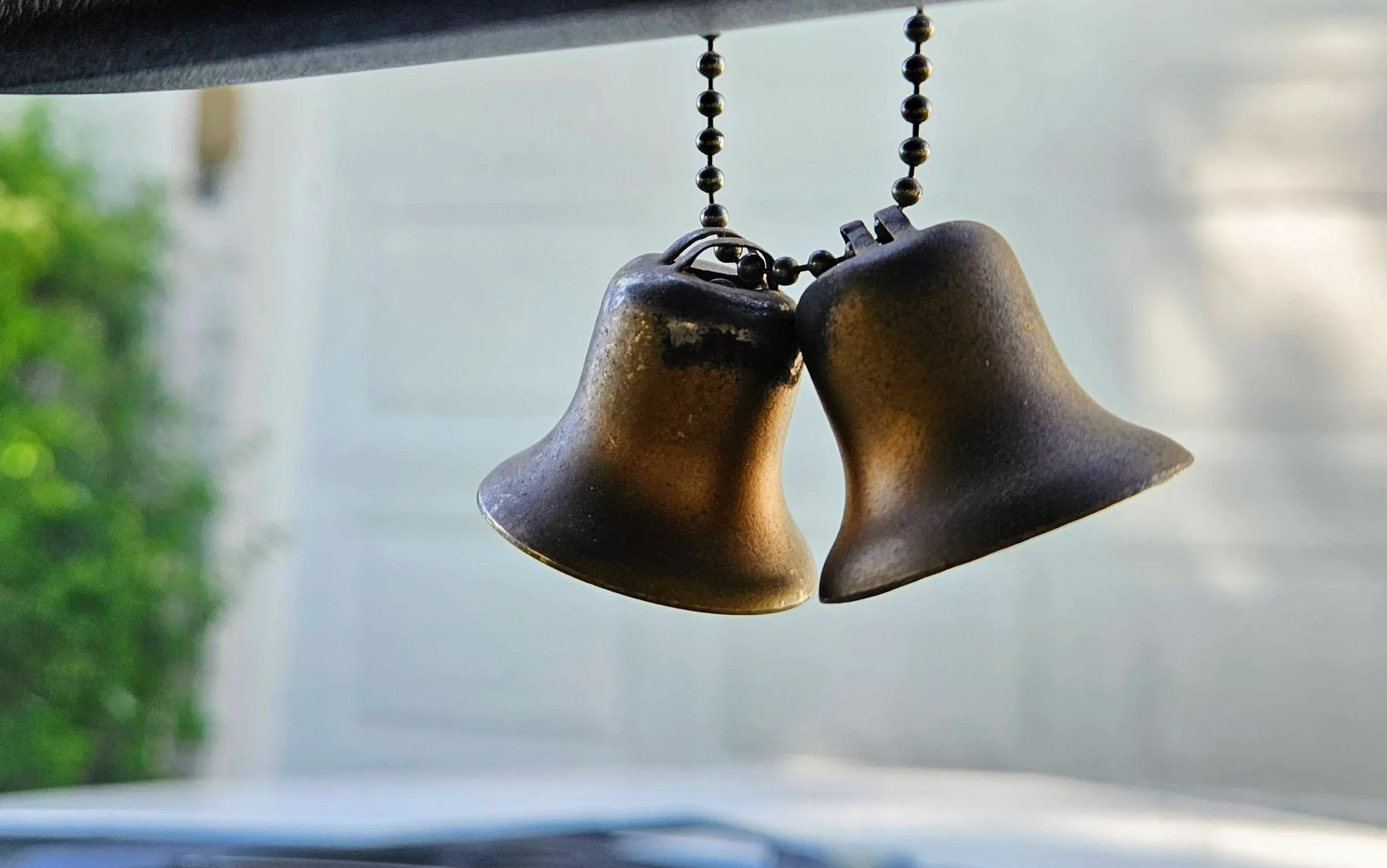 Dad had a pair of small tin bells that hung from every rearview mirror of every car he owned. They would jingle when the car hit a bump or pothole. I remember as a child waiting in the car for Mom to get done in the store. I would tap those bells repeatedly to hear them jingle as I daydreamed about nothing.